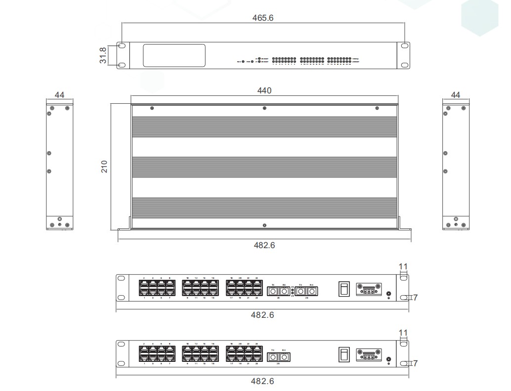 物理尺寸(宽×高×深):482.6mm×44mm×210mm 安装方式:标准19’ 1U机架式 散热形式:铝合金单肋形机箱表面散热,无风机 出线形式:前后出线 机壳防护:IP40 |