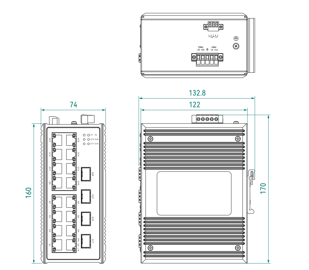 ◆ -40℃~+75℃工作温度,铝合金外壳,高效散热,IP40防护等级。