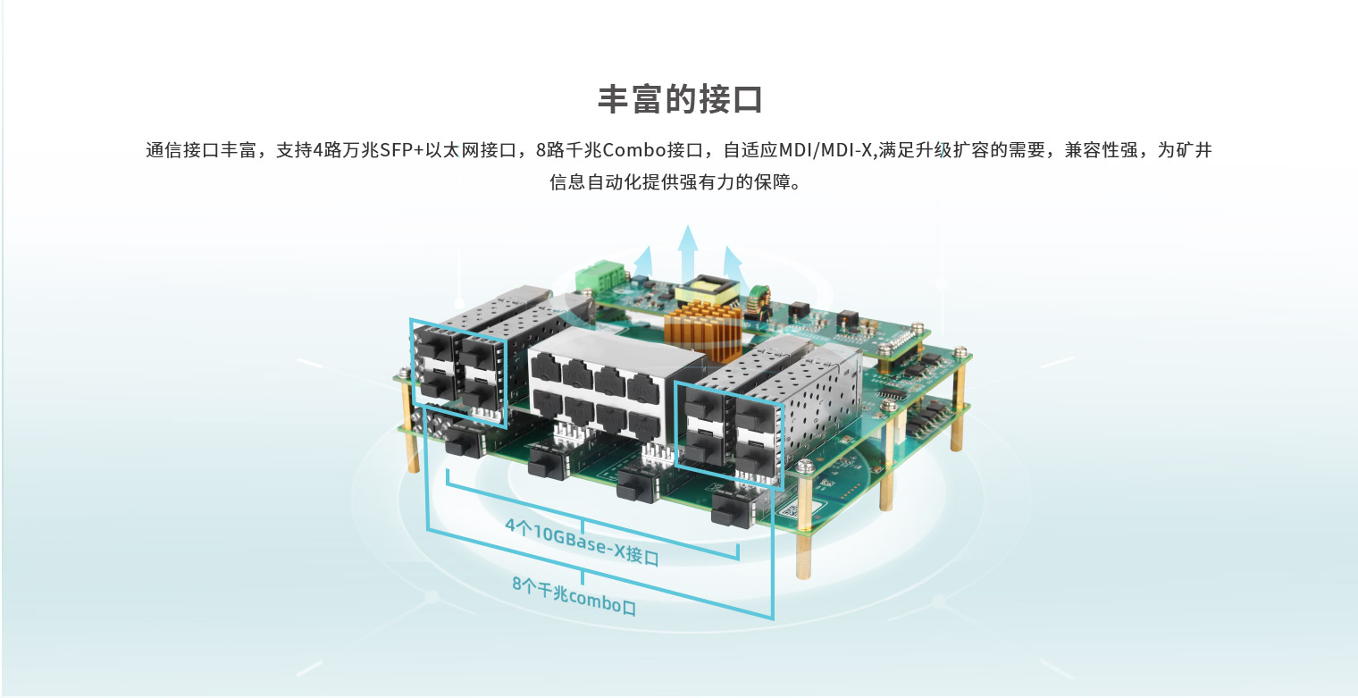 矿用以太网交换机是针对煤炭和非煤行业自主研发的符合本安要求的低功耗交换机,该交换机系列产品丰富,从地面万兆核心环网应用到井下千兆/百兆汇聚接入环网应用均可满足。除了丰富的以太网光电接口可选,产品还支持扩展RS485和CAN接口,高度稳定的集成方式,可以满足矿用分站的多功能融合需求